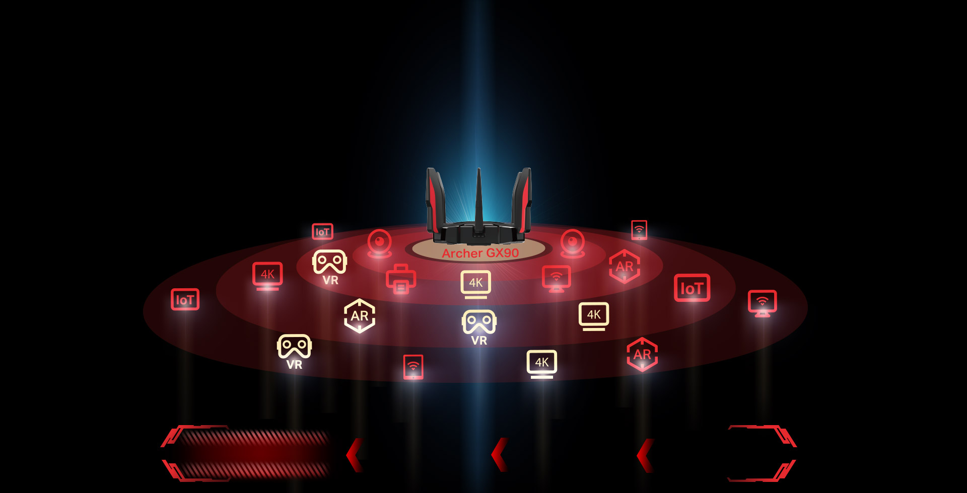 Le TP-Link Archer GX90 Maroc est un routeur Wi-Fi 6 tri-bande conçu spécialement pour les joueurs exigeants au Maroc. Il offre des vitesses combinées jusqu’à 6600 Mbps grâce à trois bandes distinctes, dont une bande dédiée au gaming pour garantir une latence minimale. Son processeur quad-core 1,5 GHz assure une gestion fluide des connexions multiples, même lors des sessions intensives.